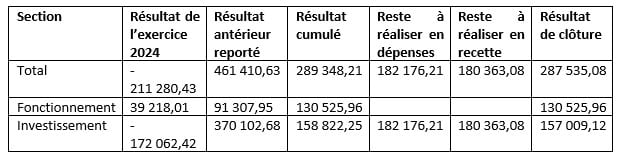 Compte tenu des résultats antérieurs reportés (461 410,63 €) et des restes à réaliser en dépenses d’investissement (182 176,21 €), le résultat de clôture est excédentaire à hauteur de 287 535,08 €
