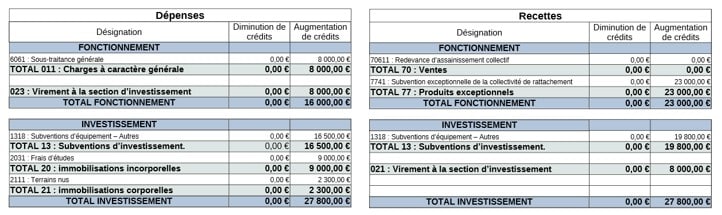 8 000 € viennent à la section de fonctionnement en dépenses au 6061 et 8 000 € à la section d’investissement.